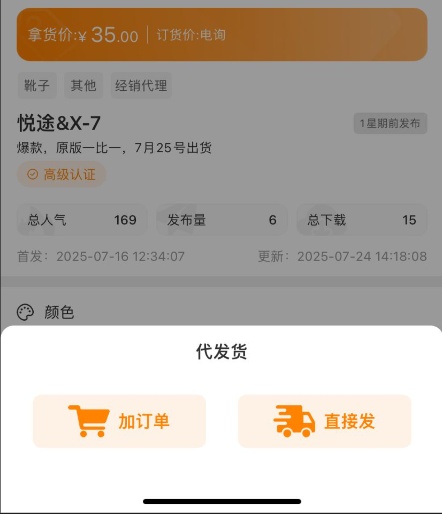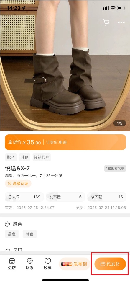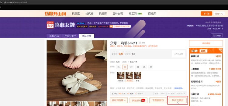 挑选商品代发:运用搜索和筛选功能找到符合您需求的女鞋款式,进入商品详情页后,选择商品的颜色、尺码、数量等规格选项,点击 “找代发拿货” 按钮。若还有其他商品需要采购,重复此操作。