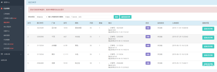 平台有些产品是不支持7天无理由退货,如果用户退货,代发商可以帮忙代销,用户提交退货申请,寄回商品,代发商收到后就会录入系统,用户就可以在我的库存里面看到产品的状态(在库:表示代发商已经收到鞋子,并且录入系统; 库外:表示代发商正去厂家换货有可能代销成功; 外售:表示代发商已经代销成功,已将货款退到账户余额)。