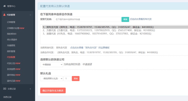 用户可以在此选择您想要合作的代发商、选择代发商还有快递公司、礼品(选填)、以及代发商的运费模版等等。