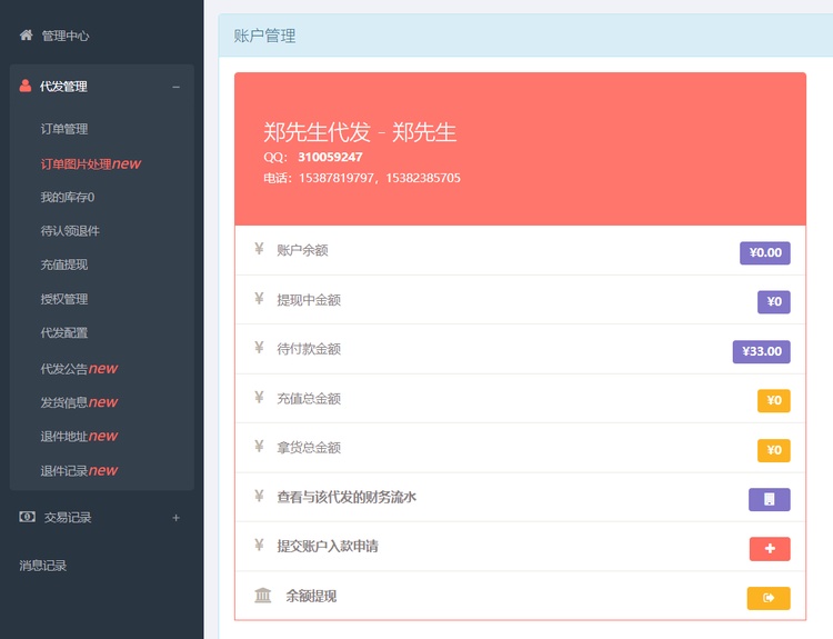 用户可以查询自己的账户余额、充值总金额、拿货总金额、提交入款申请、余额提现以及和代发商的交易明细等等。